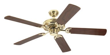 - 52-inch polished brass finish ceiling fan with five reversible walnut/oak blades, remote control adaptable